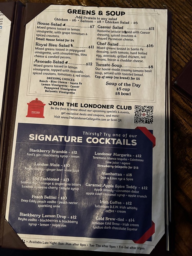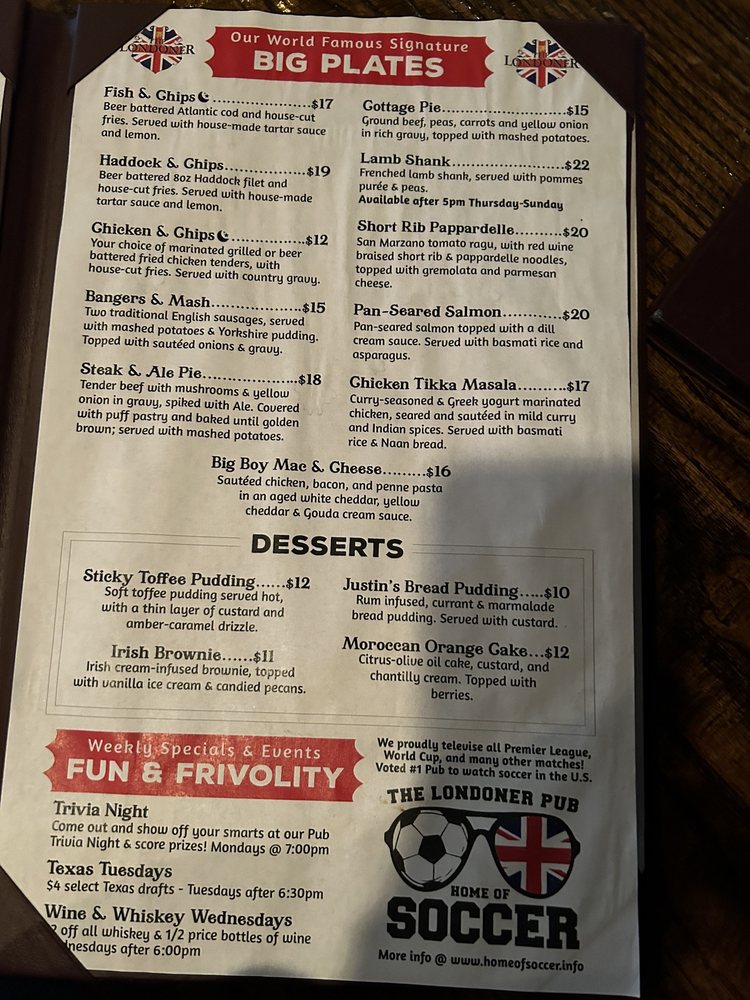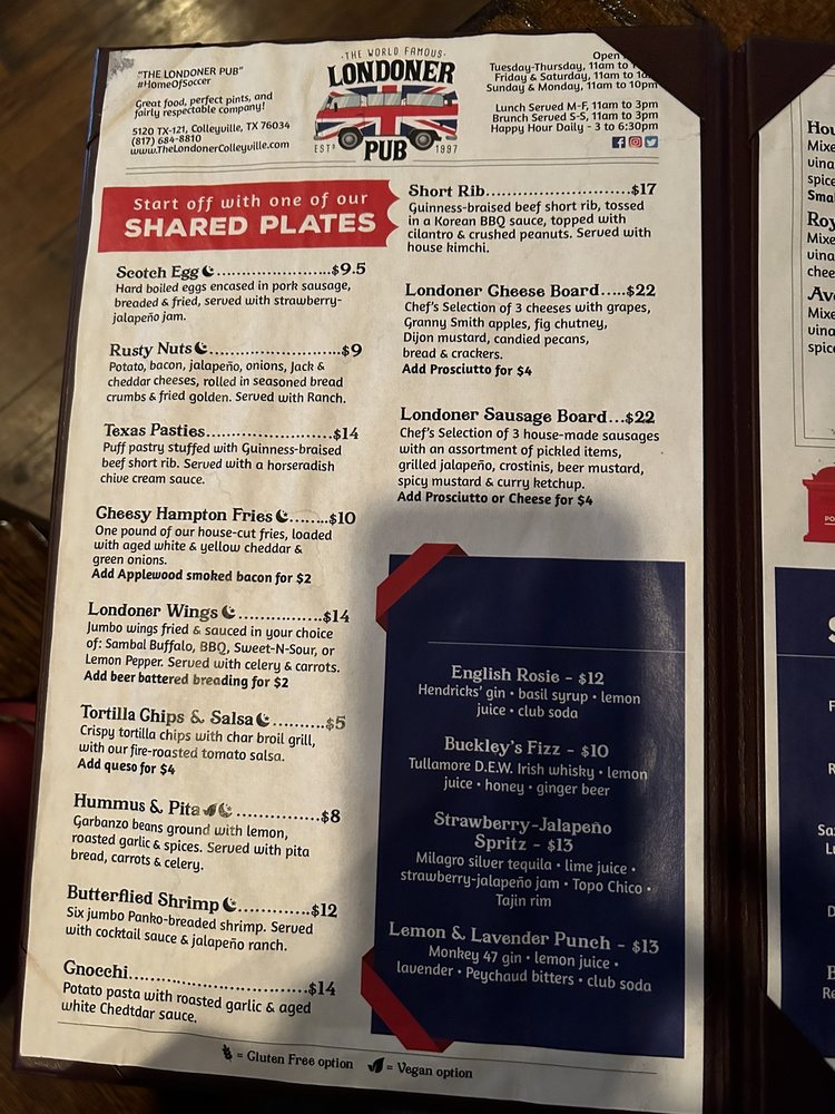 The Londoner Colleyville, a British-themed sports bar and pub, offers a range of amenities like outdoor seating, free Wi-Fi, and even dog-friendly areas. Located in Colleyville, TX, it's a casual spot perfect for lunch or dinner, with options for pescatarians and limited vegetarian choices. Their menu features tantalizing appetizers like Texas Pasties and Londoner Sausage Board, as well as hearty entrees like Haddock and Chips and Short Rib Pappardelle. The Chef Salad and Tomato Soup are popular choices, while the Fish and Chips is a must-try classic dish. With a full bar, happy hour specials, and a welcoming atmosphere, The Londoner Colleyville is a great spot for a night out with friends or family. Don't miss their top-notch service and diverse menu offerings!